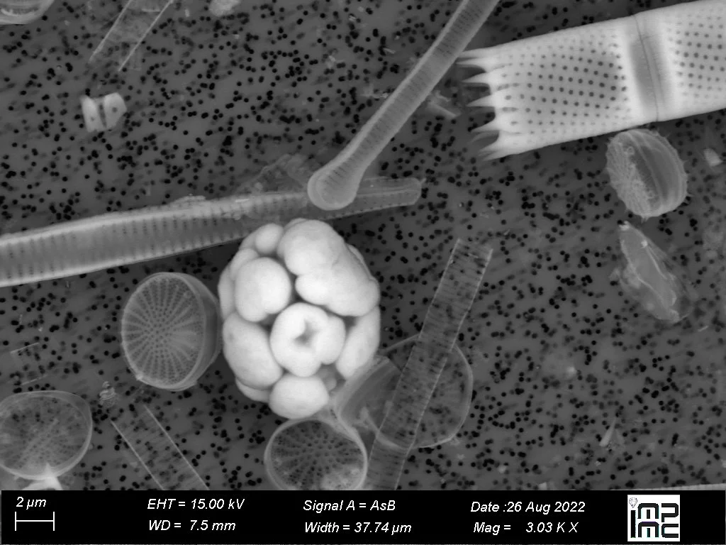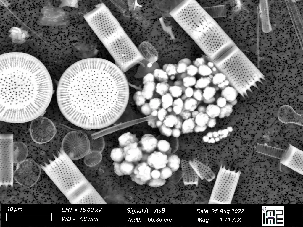 The detection of iACC forming capability in MTB found in Lake Pavin expands the repertoire of ACC formation in prokaryotes, and suggests that ACC formation could be a more ubiquitous and diversified process in chemically stratified aquatic environments than previously thought. An overarching goal of this work is to understand the genetic and environmental determinants of intracellular carbonate formation in MTB. My current project in this context aims to understand the factors that control the abundance and population structure of ACC-forming MTB in Lake Pavin sediments. To address this objective I combine fine scale mineralogical and geochemical measurements with high-resolution microscopy and spectroscopy techniques. Some examples of the different type of ACC forming MTB and non-magnetic ACC forming bacteria found in Lake Pavin sediments are shown below.