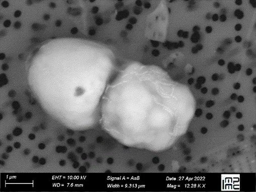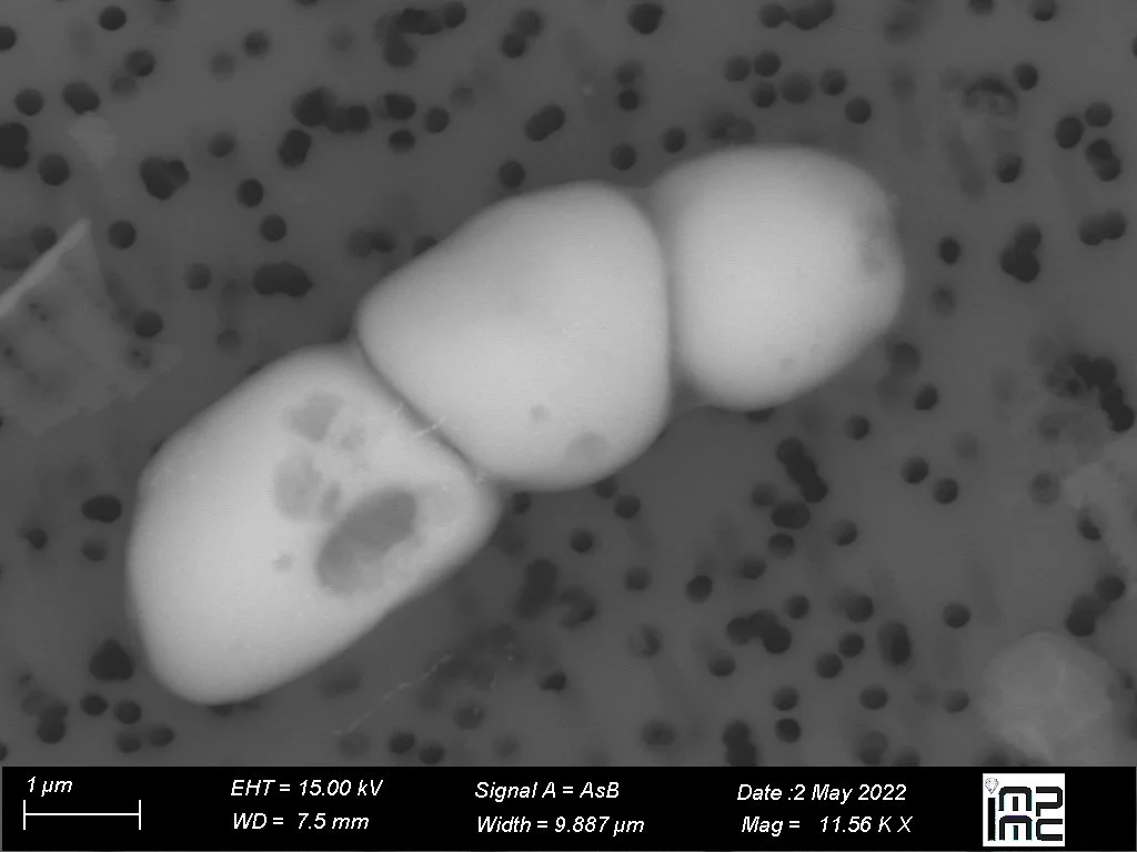 Magnetotactic bacteria (MTB) refers to a unique group of morphologically, phylogenetically, and physiologically diverse microorganisms thriving mostly at oxic–anoxic boundaries of aquatic habitats. Recent field studies in Lake Pavin led to discovery of MTB that were shown to form intracellular amorphous calcium carbonate (ACC). Below is an electron microscopy image of ACC forming MTB, where ACC inclusions are identified as white granules.